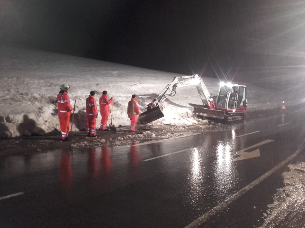 Ein Schneerutsch verlegte die L2 und drückte ein Microcar gegen die gegenüberliegende Schneewand. Sperren der L2 und Räumen der Straße. Umleiten eines Baches der ebenfalls auf die Straße lief.
