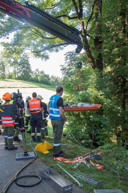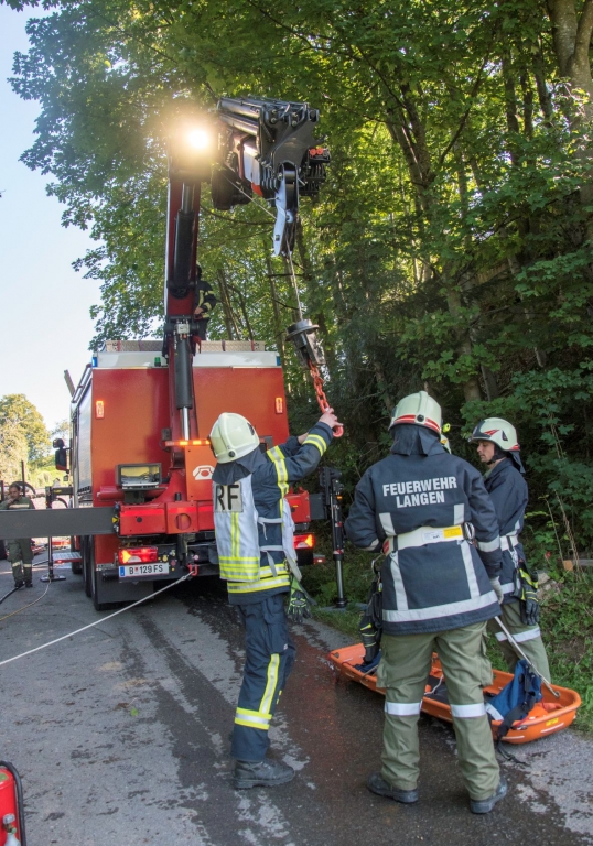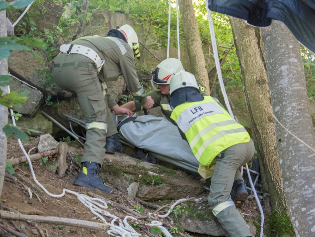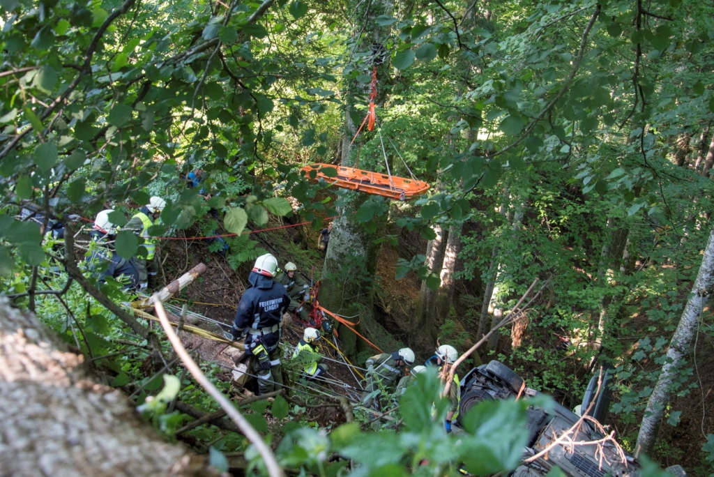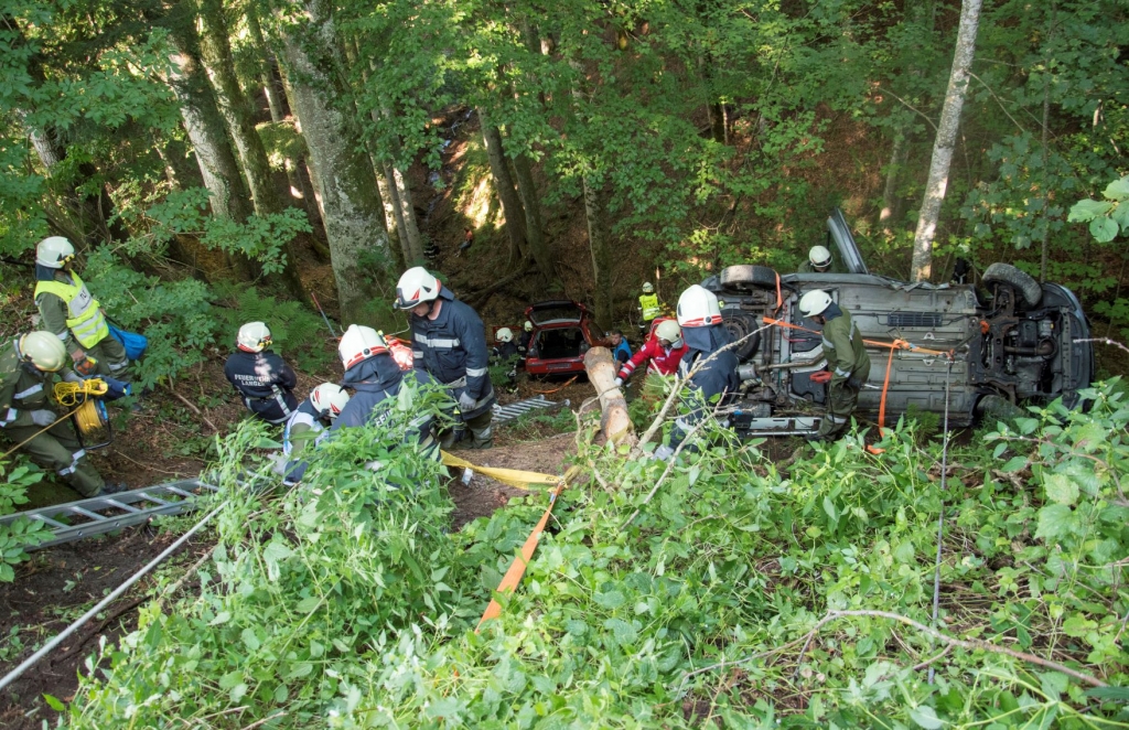 LFB→ Sichern der 2 PKW im Tobel, Zugang ins Tobel schaffen, Patientenbetreuung, Materialtransport der Geräte ins Tobel sowie Unterstützung bei der Bergung der Verletzten.