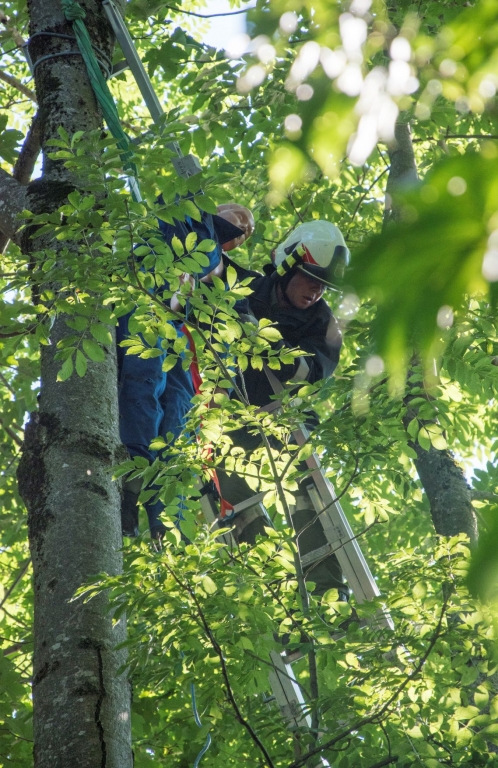 TLF→ Befreiung der Personen unter dem Block-wagen, Rettung von dem Fallschirmspringer in der Baumkrone.